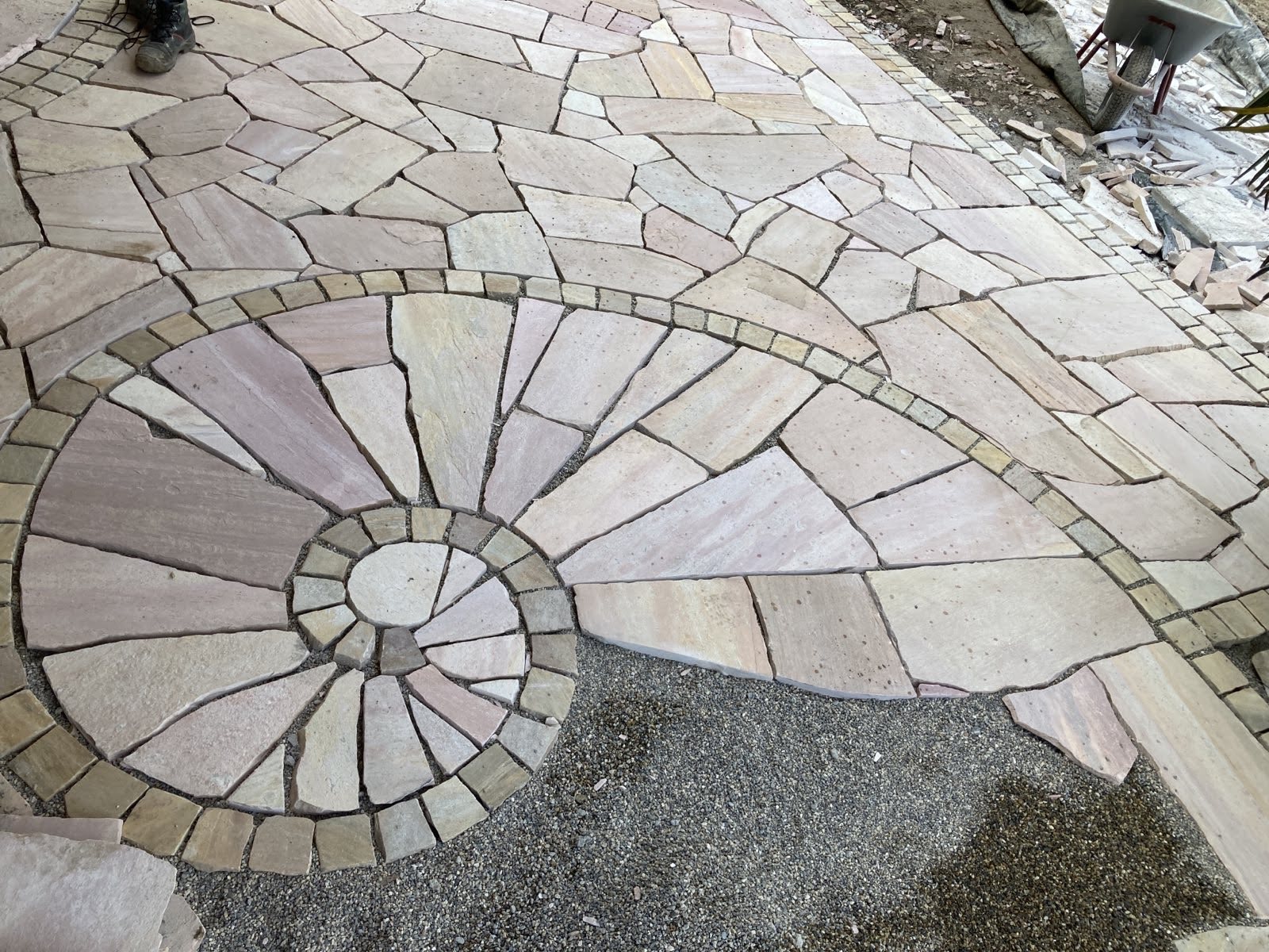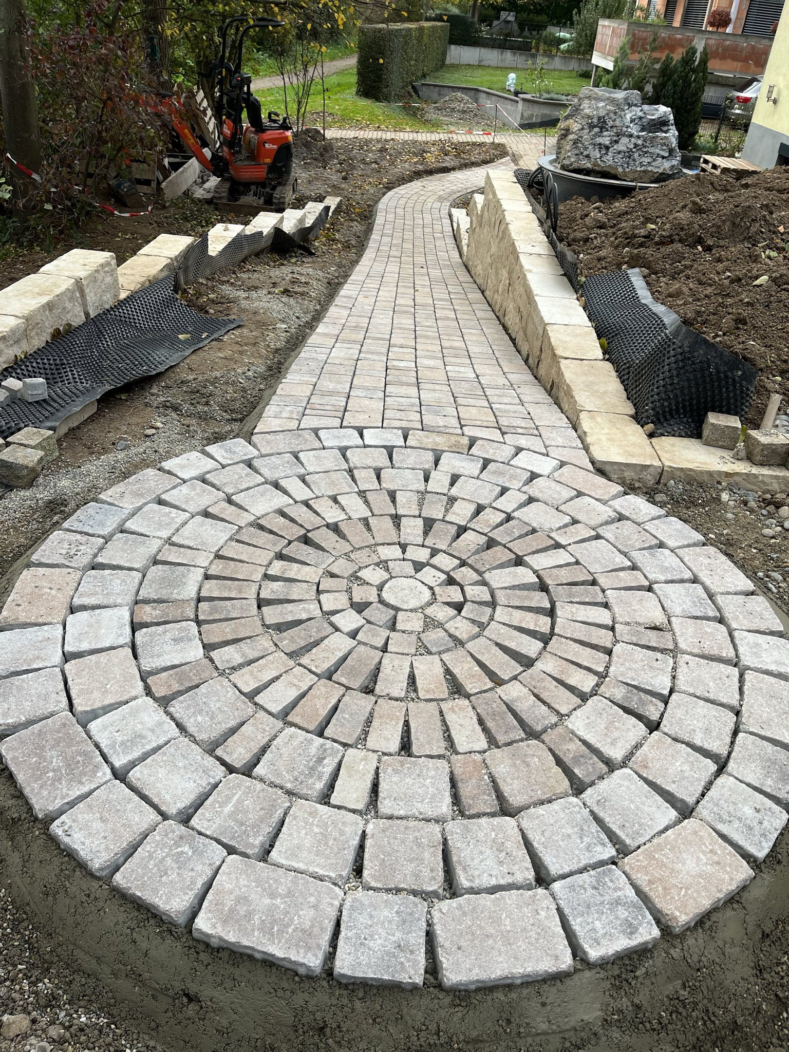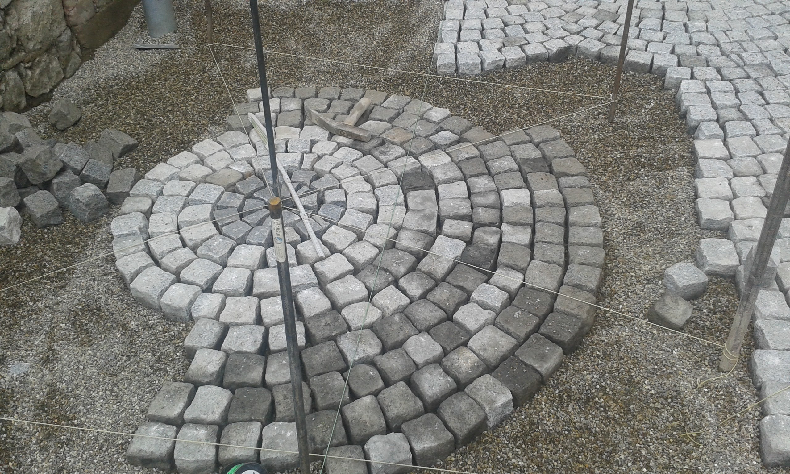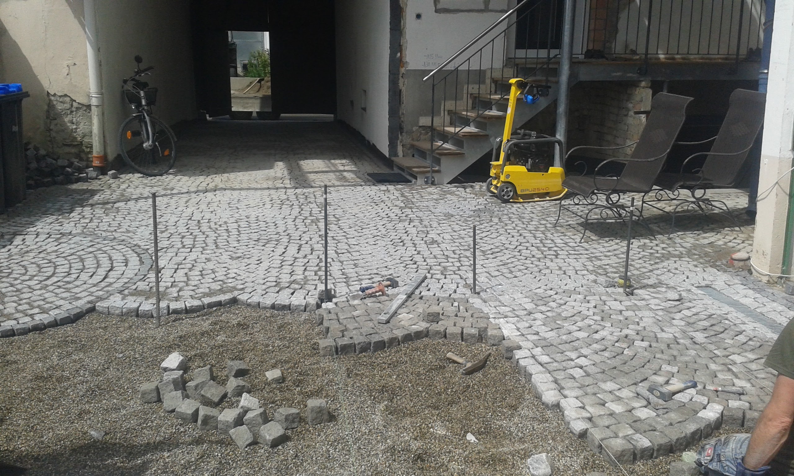 Vorbereitung des Untergrundes und legen von Natursteinpflaster (Porphyr)